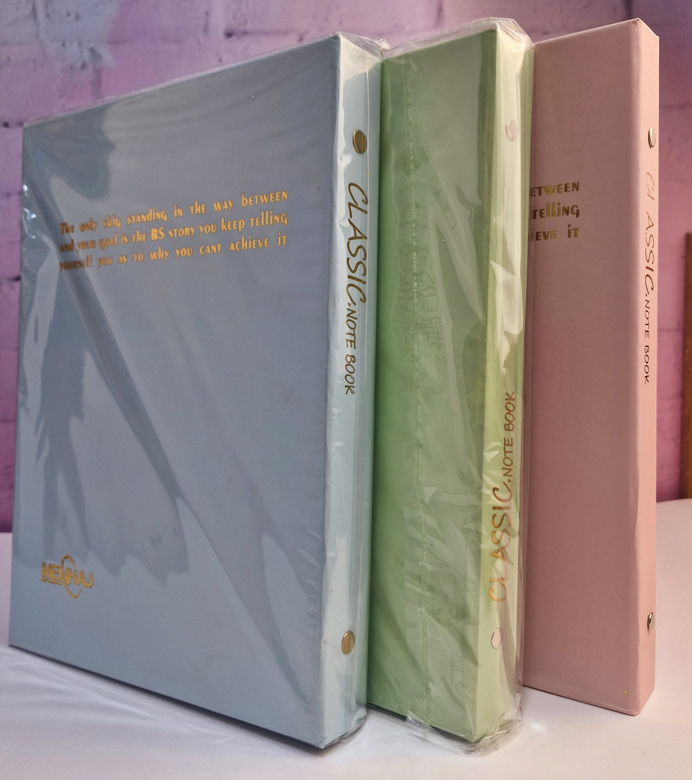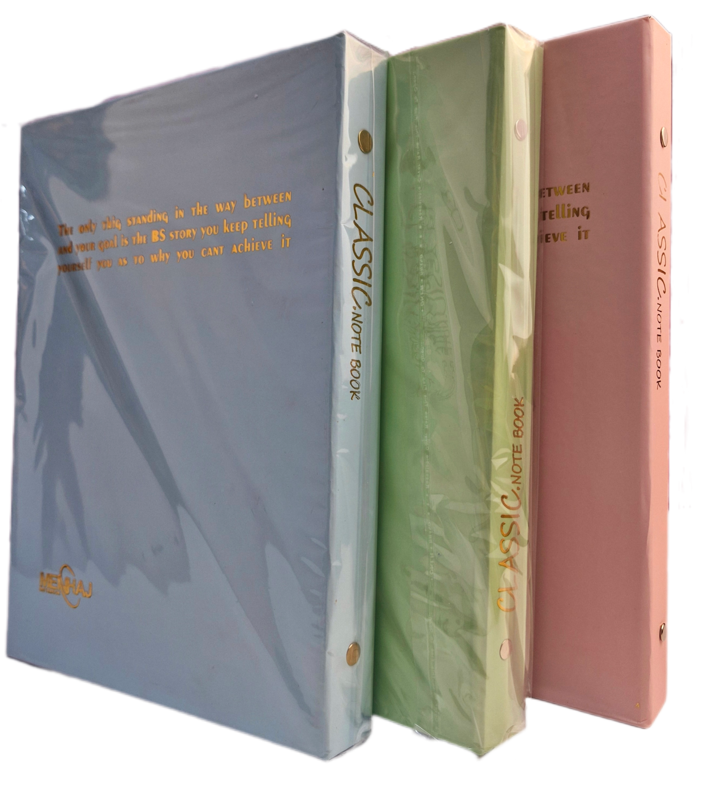 نوع کالا: دفتر کلاسوری جنس: مقوا و پلاستیک (سلفون) بادوام، کاغذ ویژگی ها: 100 عدد برگه، رنگ های پاستیلی متفاوت ابعاد: 36 در 20 در 4 کیفیت: بالا